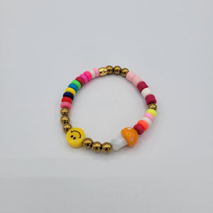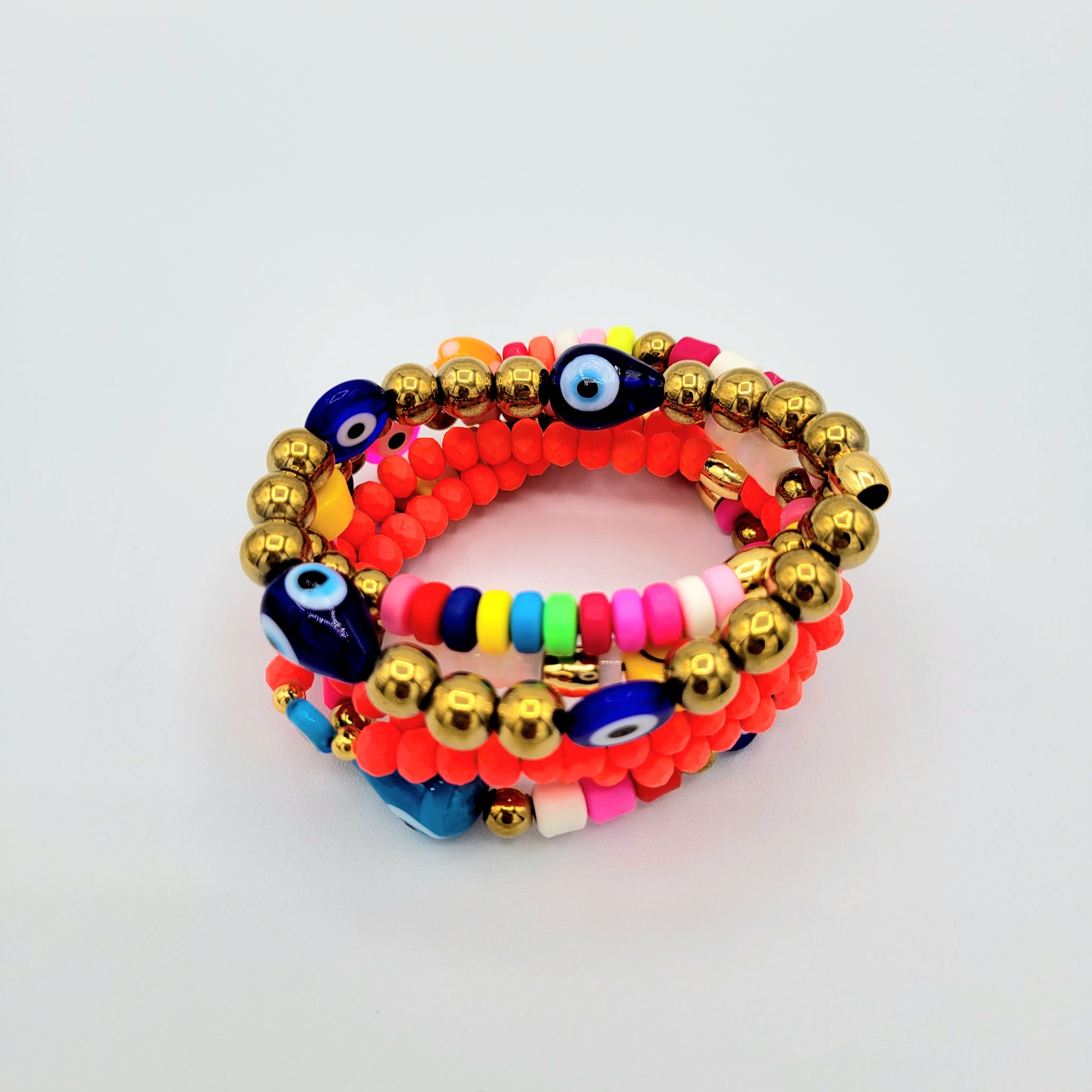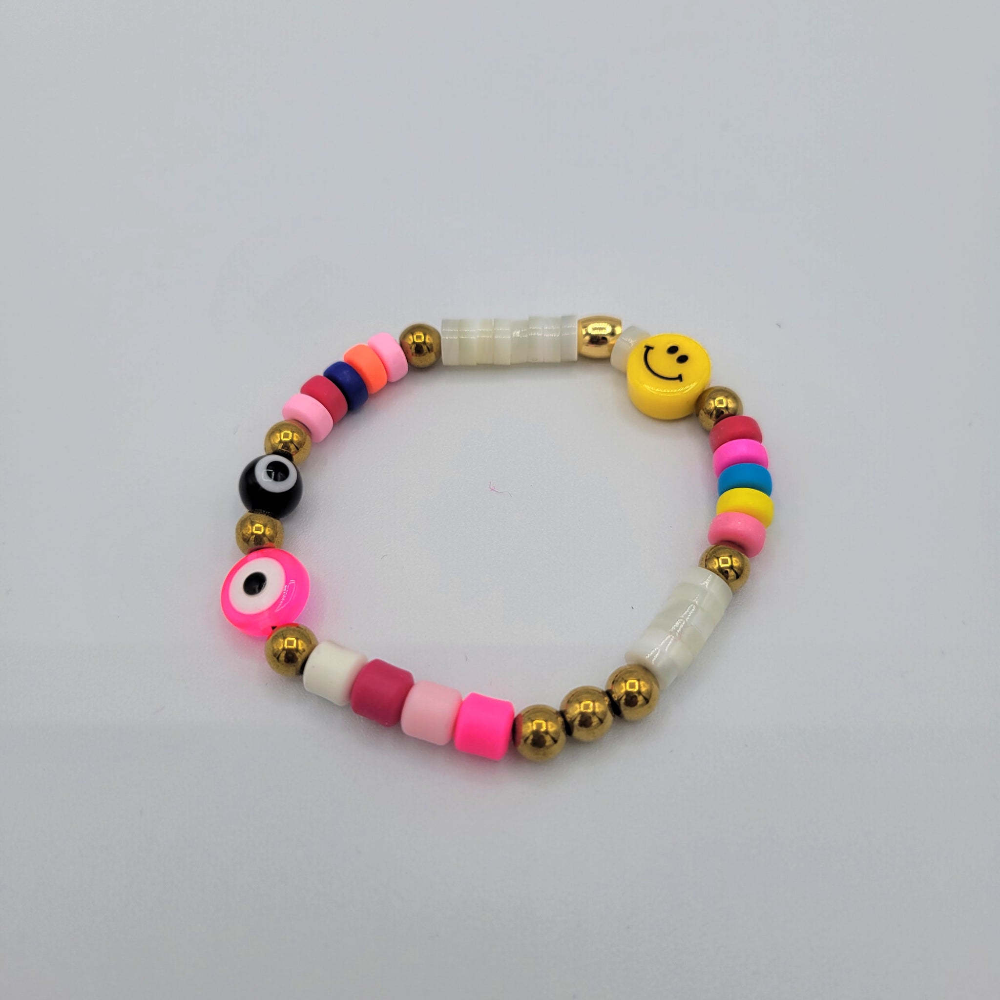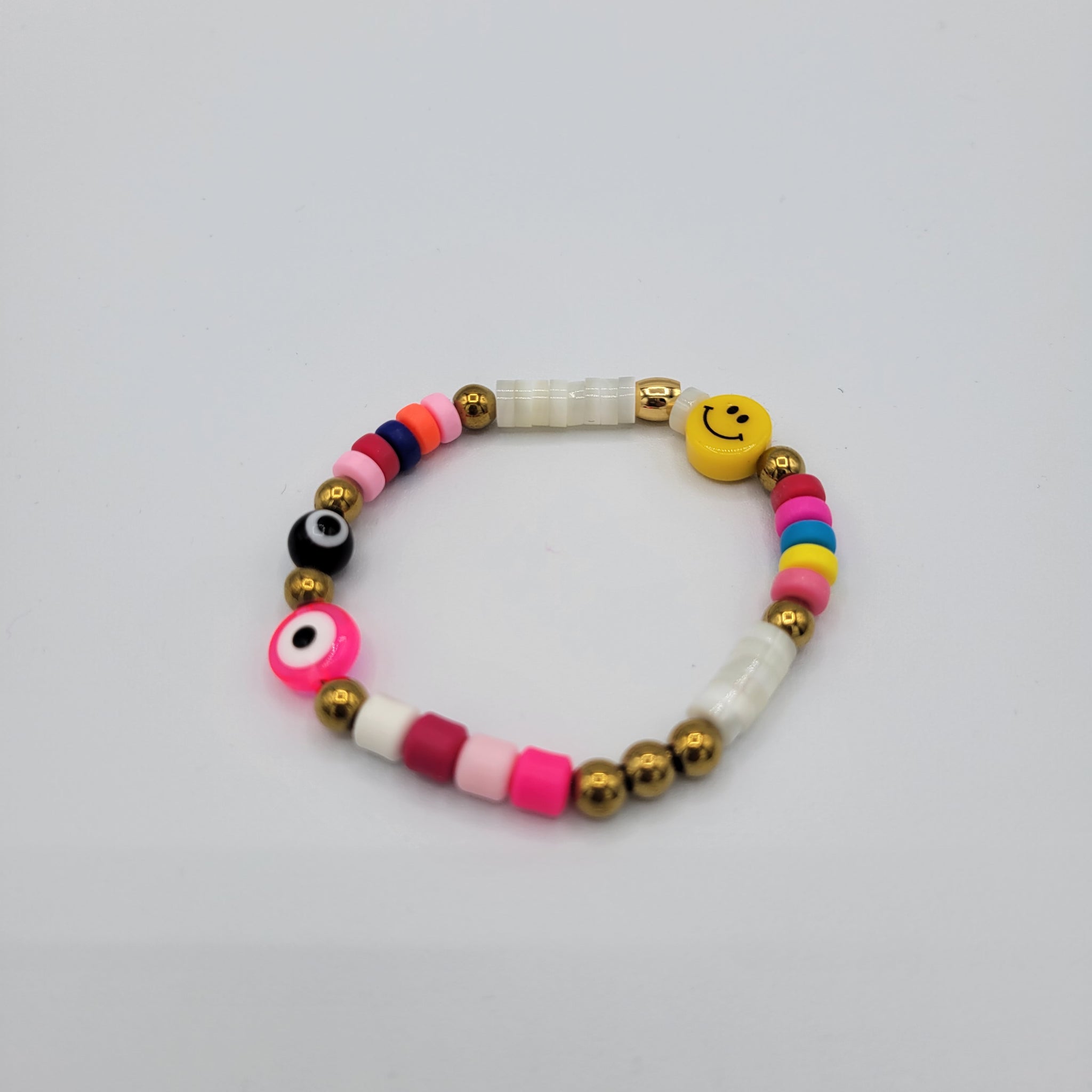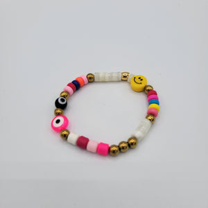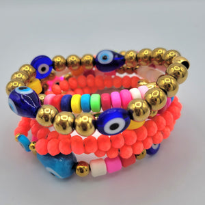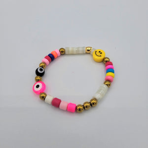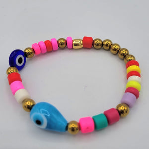 A mix of semi precious stones are strung to create this colorful bracelet. Glass eye beads imported from Greece, hematites purchased from local suppliers, and clay beads.