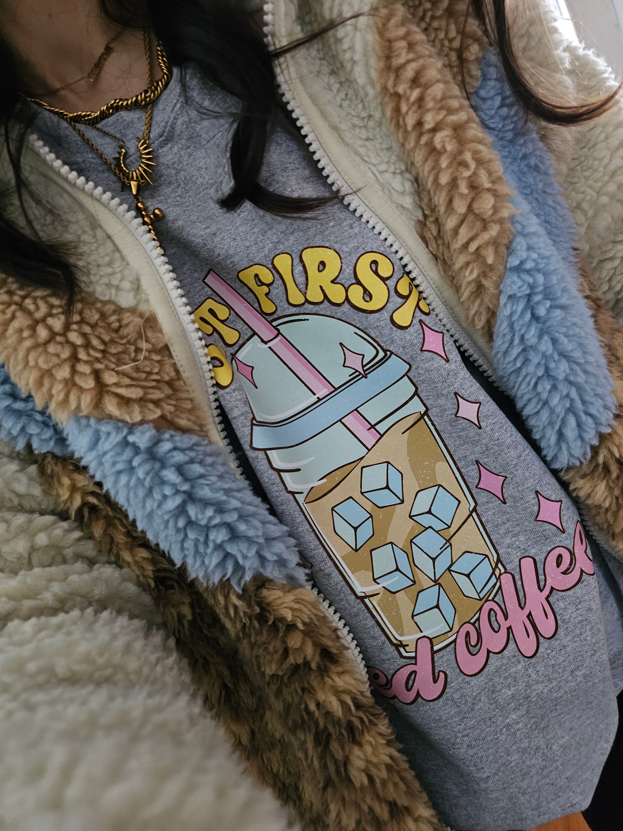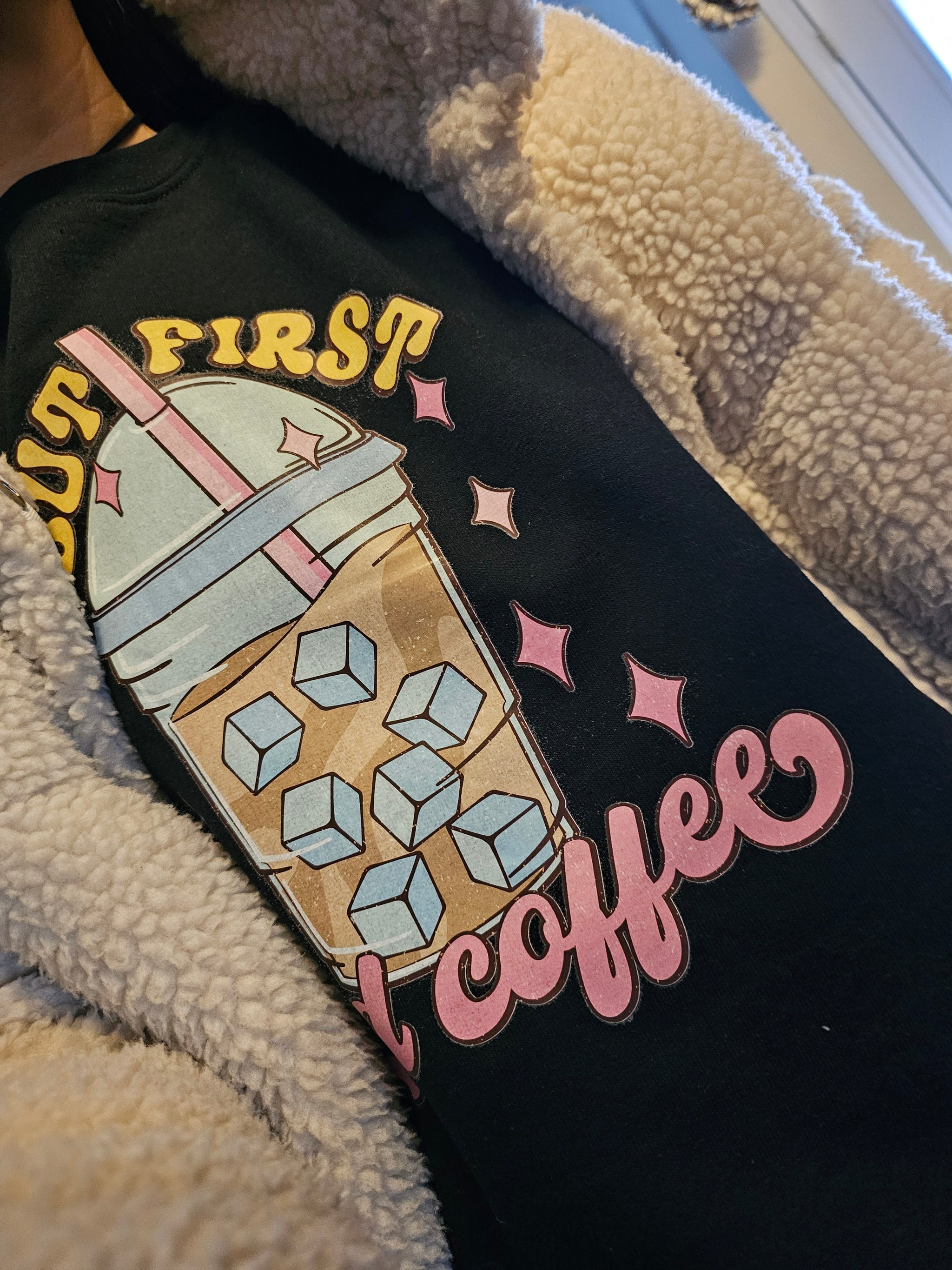 "But first iced coffee" crewneck is made of 50/50 cotton poly blend. Sweater is handpressed in our workshop.