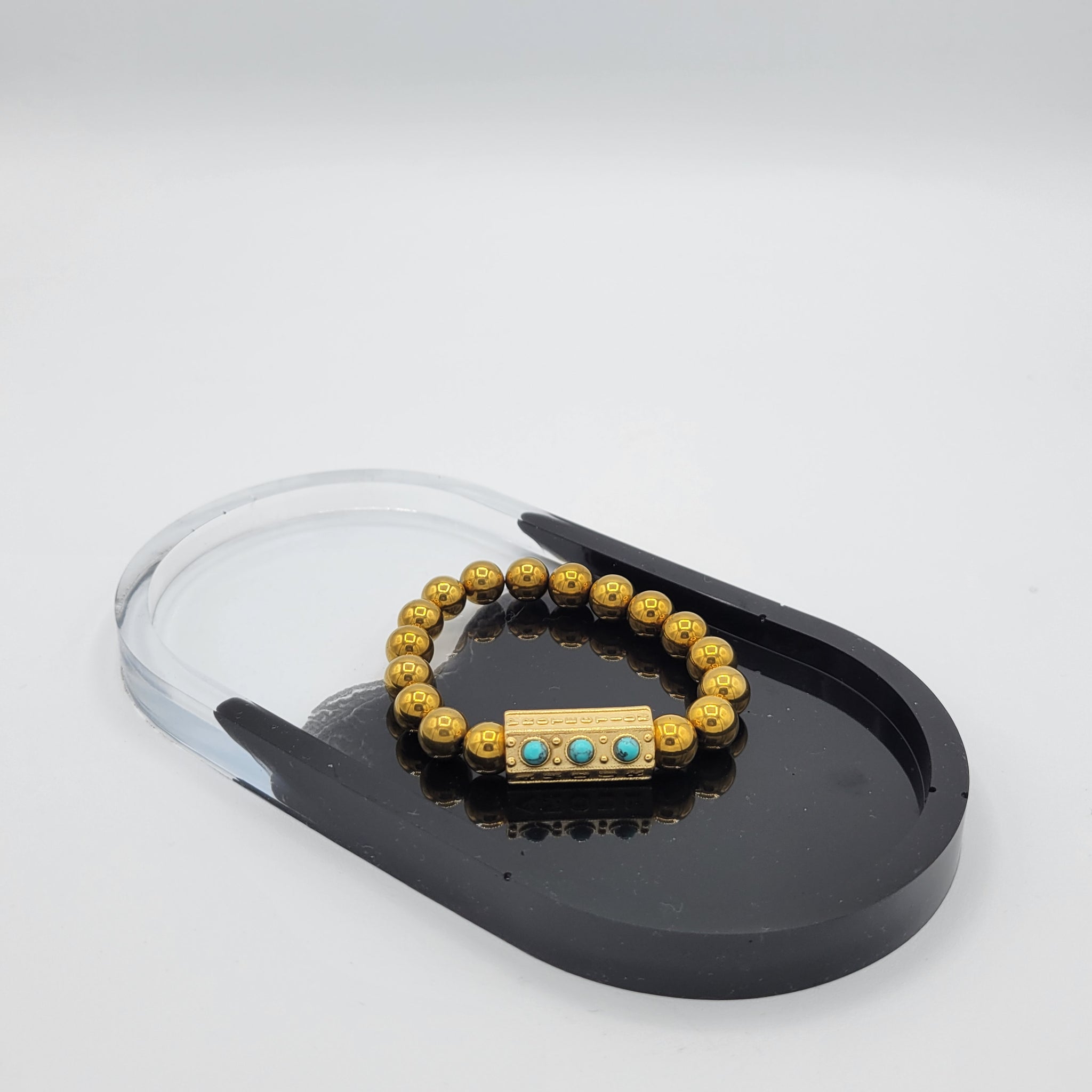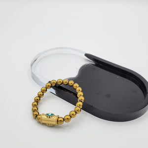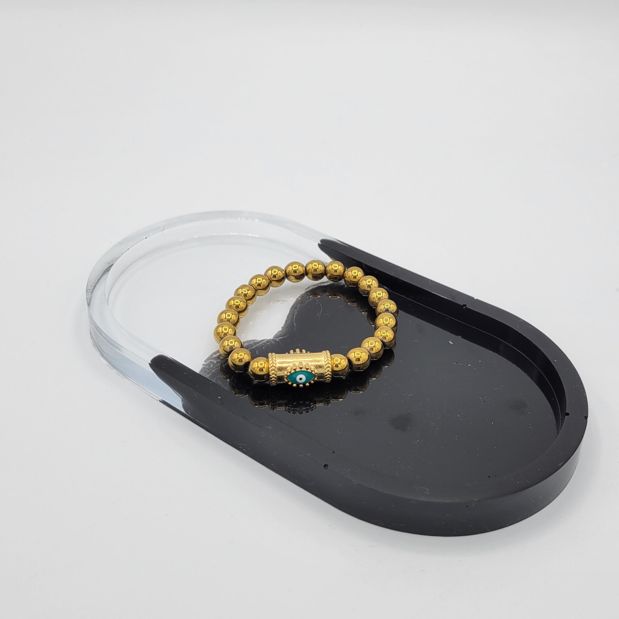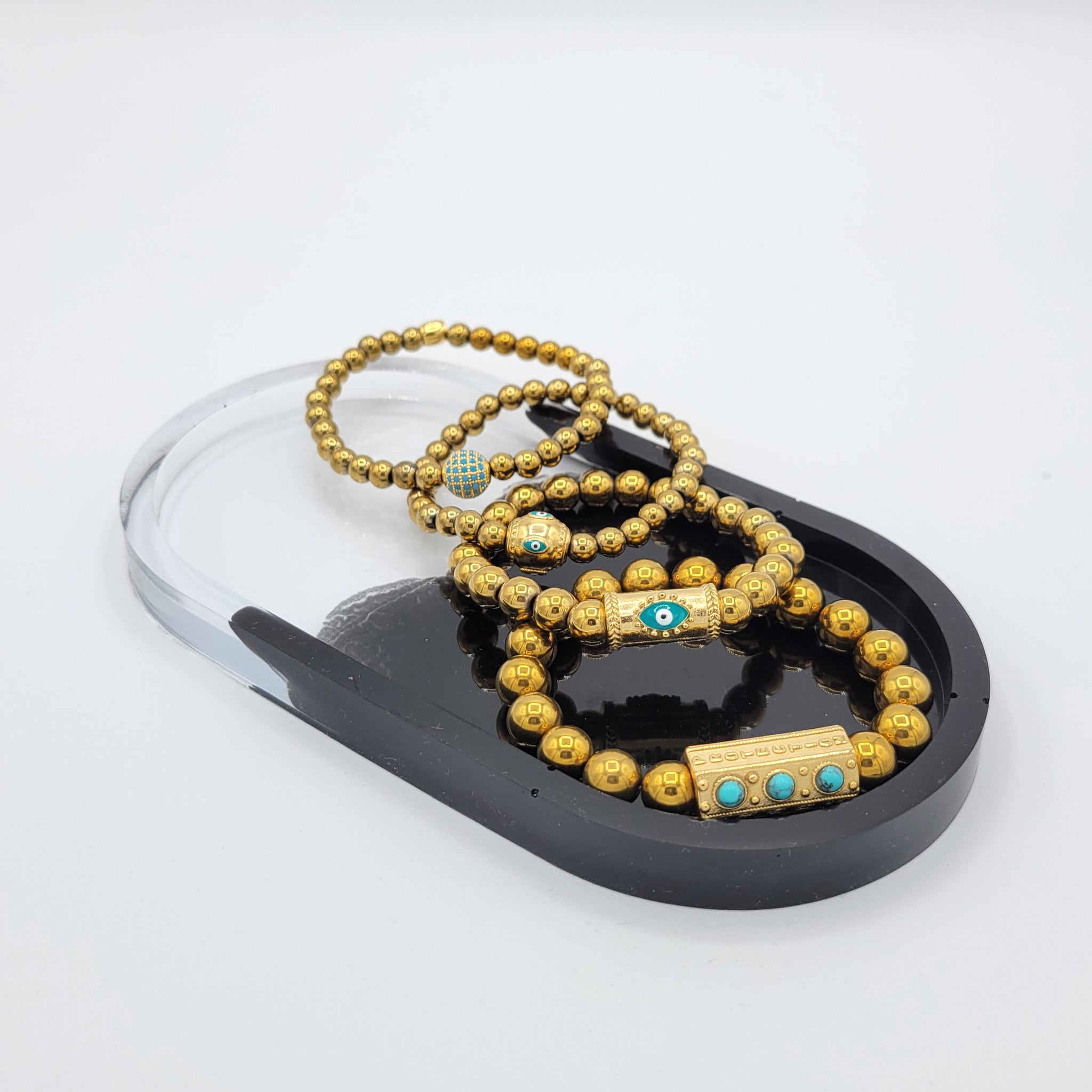 Gold plated over hematite stretch bracelets. The bracelets are handmade with semi precious stones and 1mm stretch elastic. Evil eyes tubes and beads are made of gold plated stainless steel and turquoise enamel.