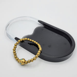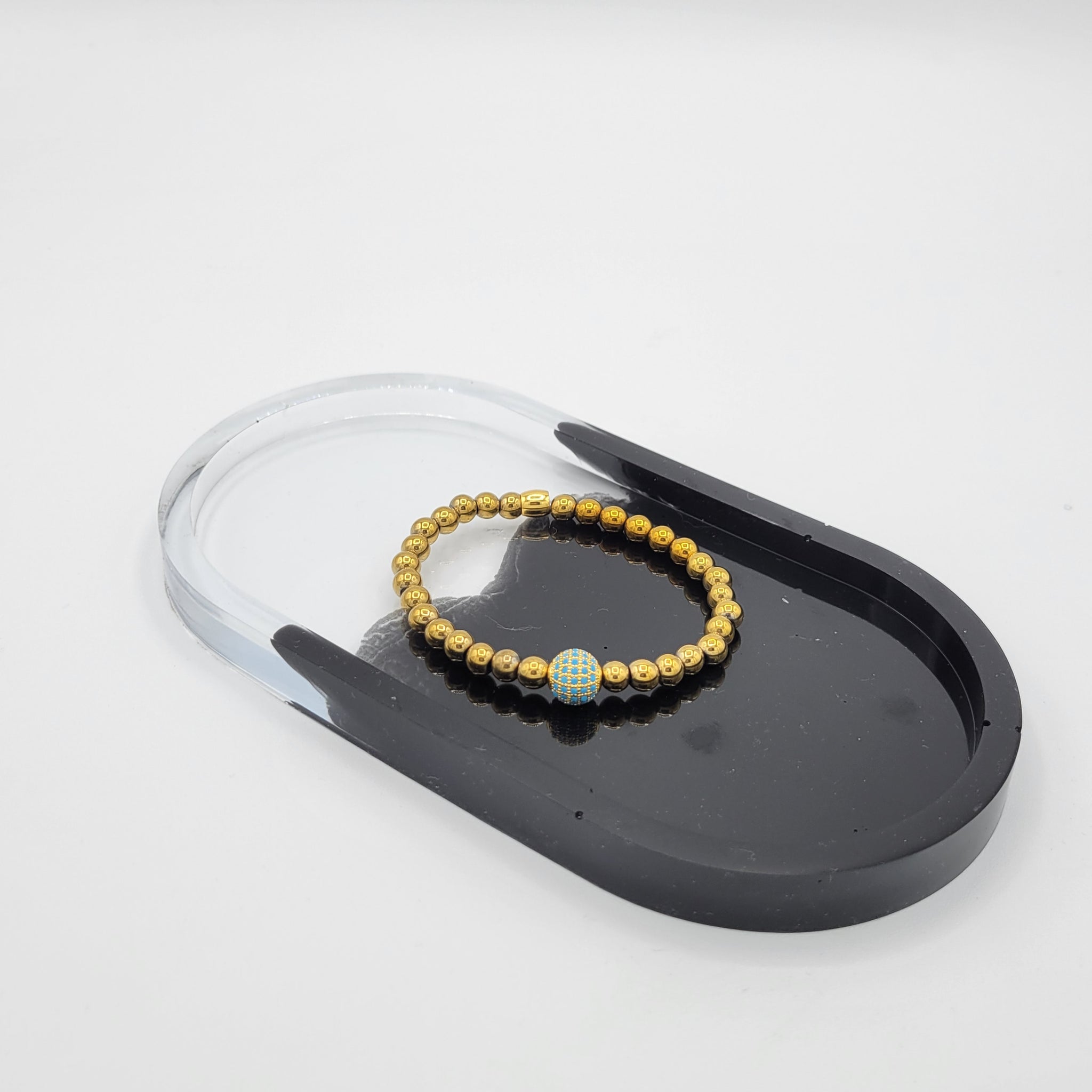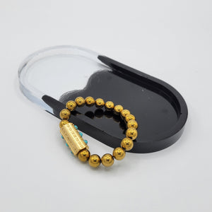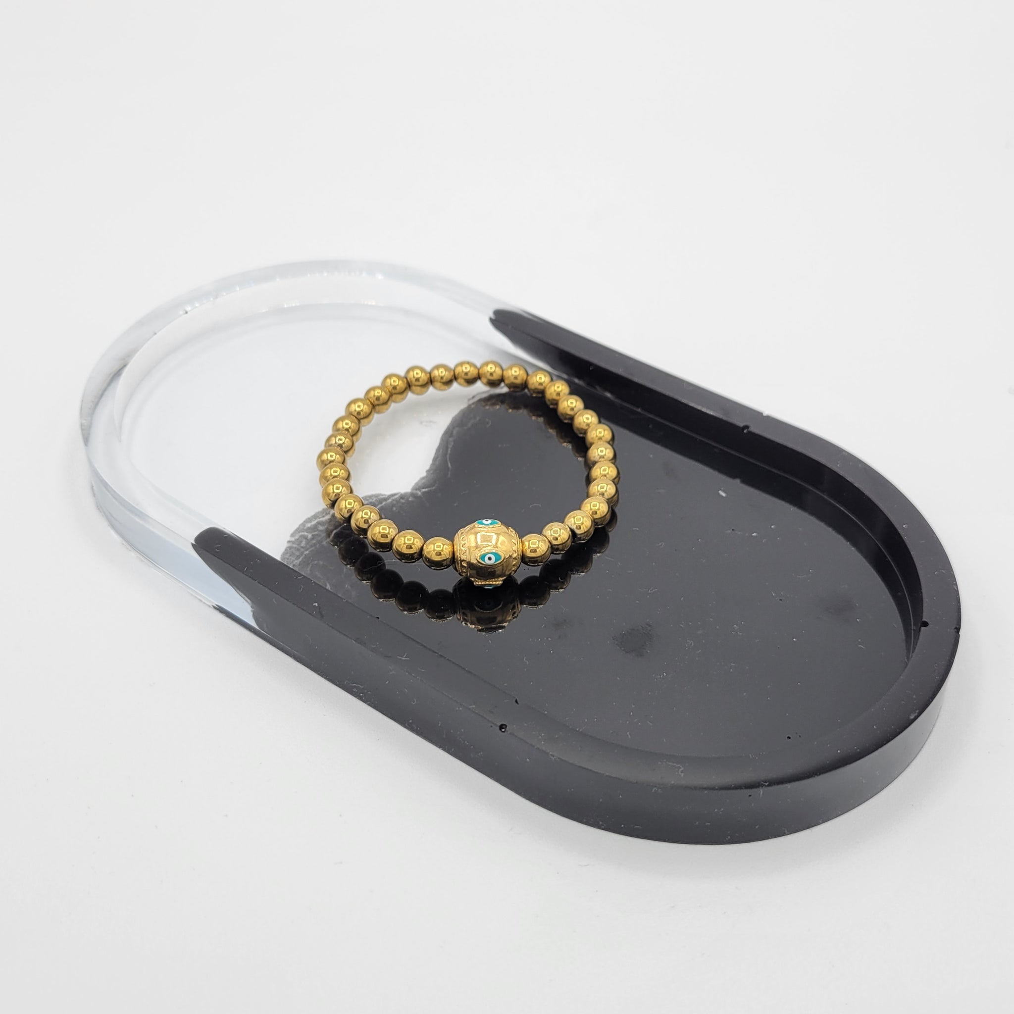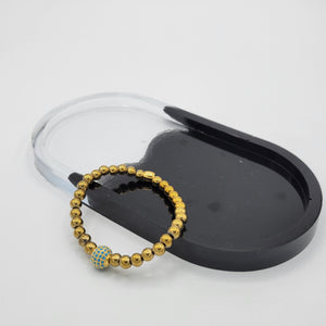 Gold plated over hematite stretch bracelets. The bracelets are handmade with semi precious stones and 1mm stretch elastic. Evil eyes tubes and beads are made of gold plated stainless steel and turquoise enamel.