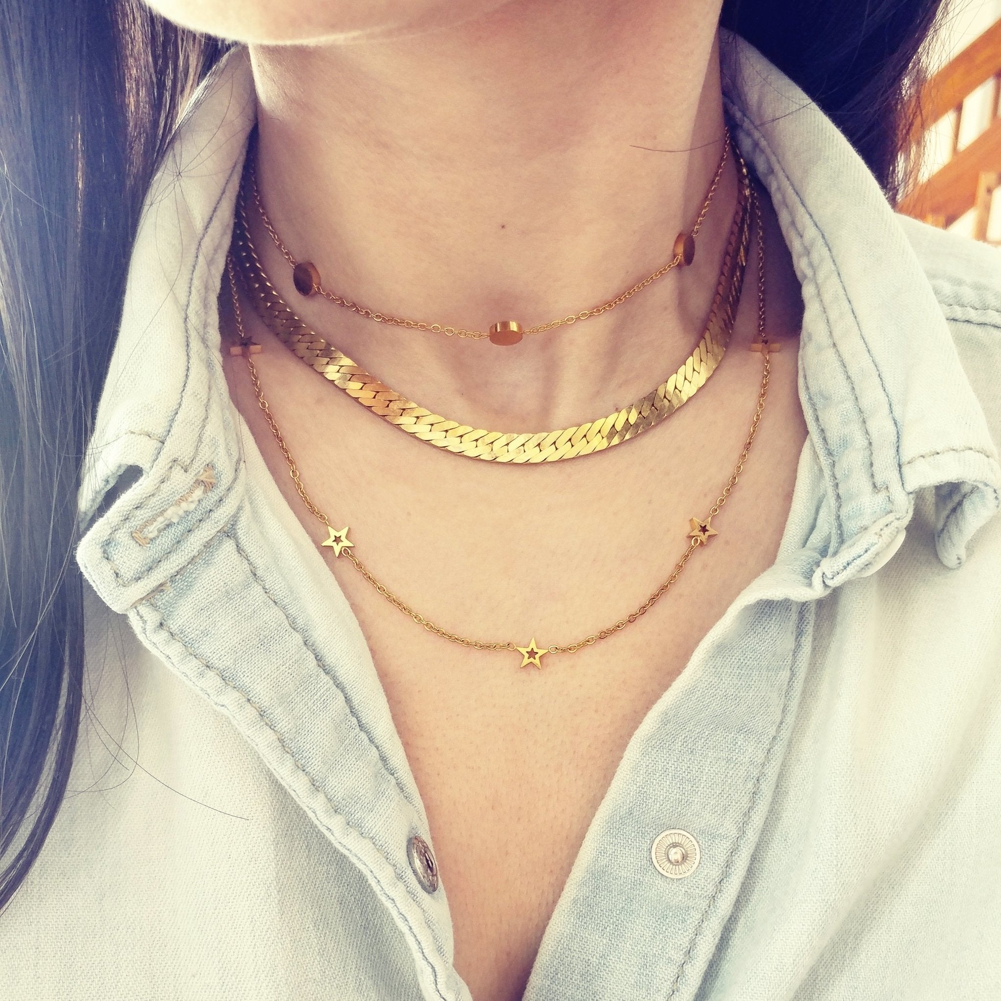 Collier or est en acier inoxydable plaquée or 18k avec chaîne d'extension. Fermoir en pince de homard.